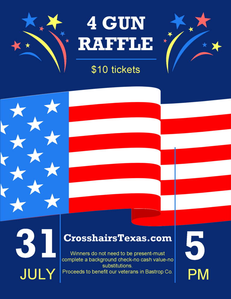 Crosshairs Texas is holding their annual July raffle with ONLY 500 tickets available. Your $10 Raffle donation goes to support the various Veteran & Youth events that Crosshairs Texas gives their time, money and products. All the proceeds stay in Bastrop County.